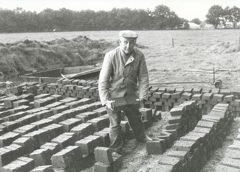 4070 Willem Schokker aan het turven tijdens het Flaeijelfeest van september 1982. Op de achtergrond is de baggelbak zichtbaar. Gerelateerde